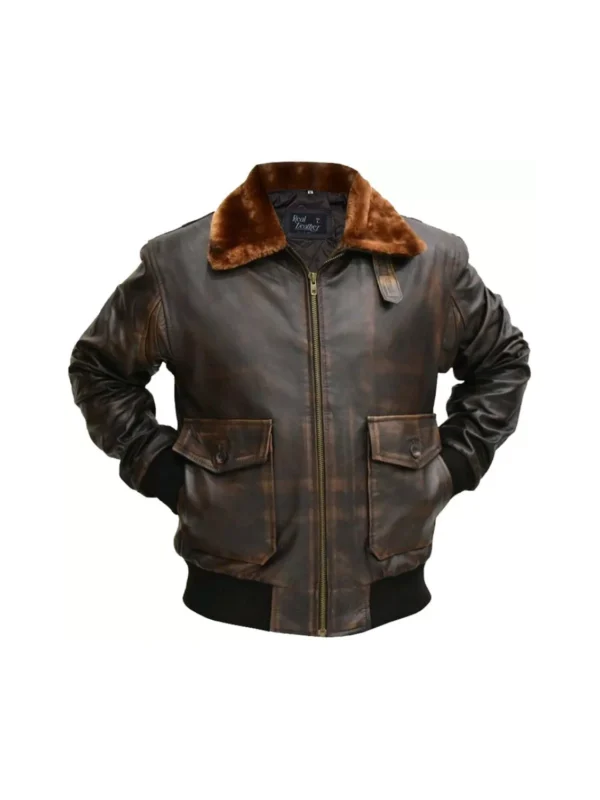 - Key features: Distressed brown leather, spread collar, rib-knitted cuffs + hem for that snug pilot fit, YKK front zipper.