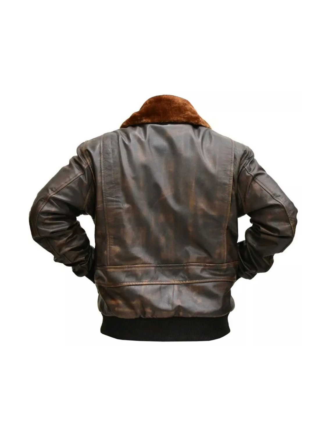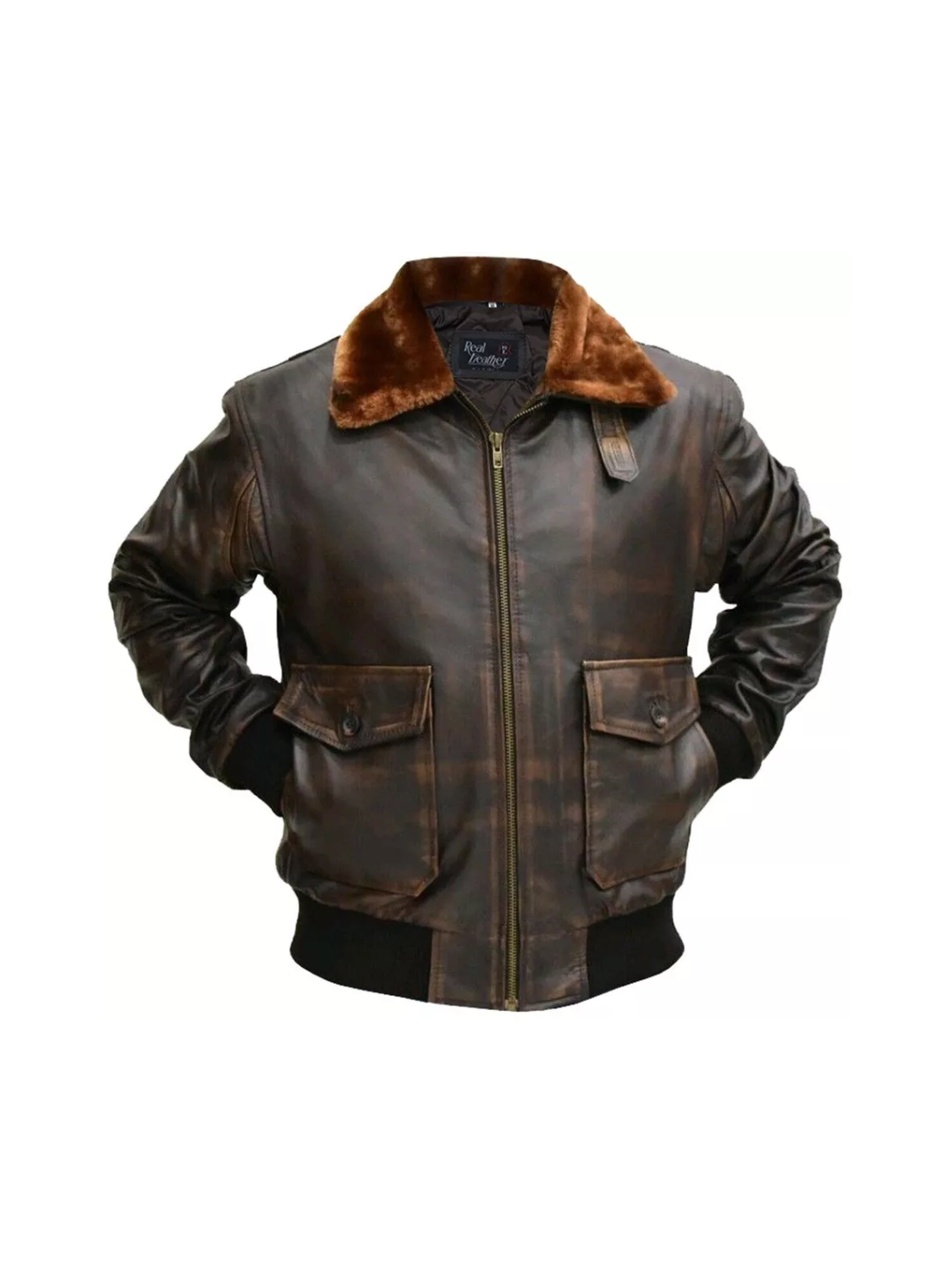 - Key features: Distressed brown leather, spread collar, rib-knitted cuffs + hem for that snug pilot fit, YKK front zipper.