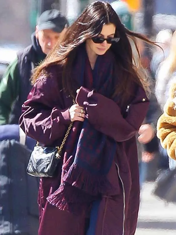 Anne Hathaway NYC 2026 Bomber Coat: The Real Burgundy Satin Look