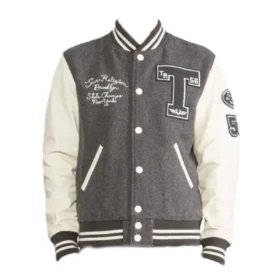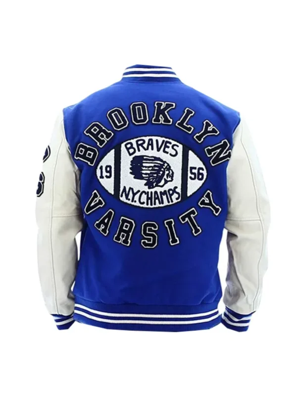 This jacket is inspired by classic American varsity silhouettes, complete with contrasting leather (or faux leather) sleeves, ribbed cuffs and hem, and bold chenille-style patches that celebrate New York’s champion spirit. At the heart of the design is a proud “NY” or “Brooklyn Brave” graphic, embroidered or printed across the chest and/or back.