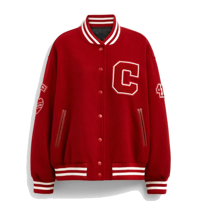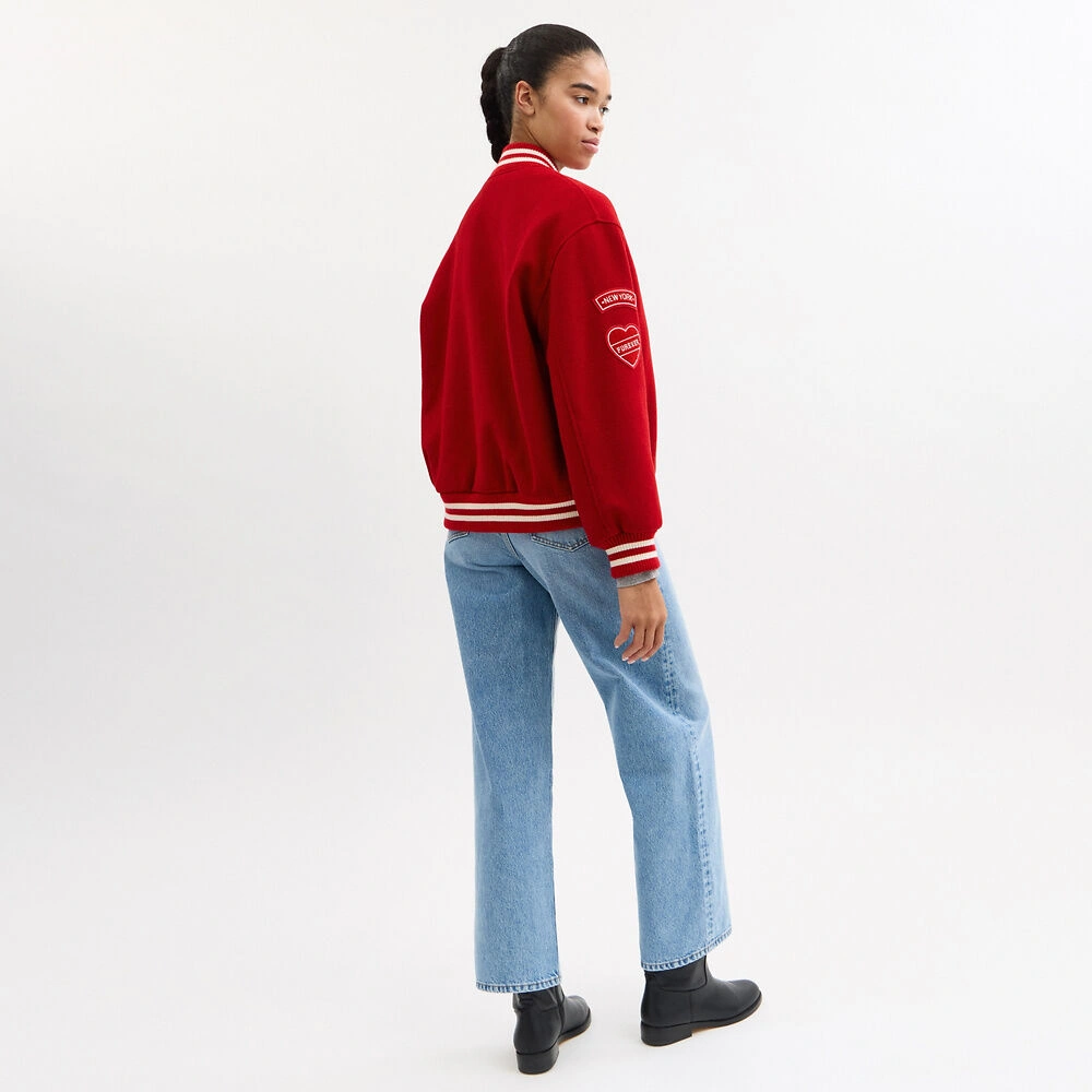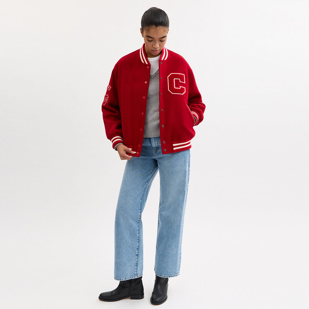 Own Your Look with This Coach Varsity Jacket in Bold Red Wool
