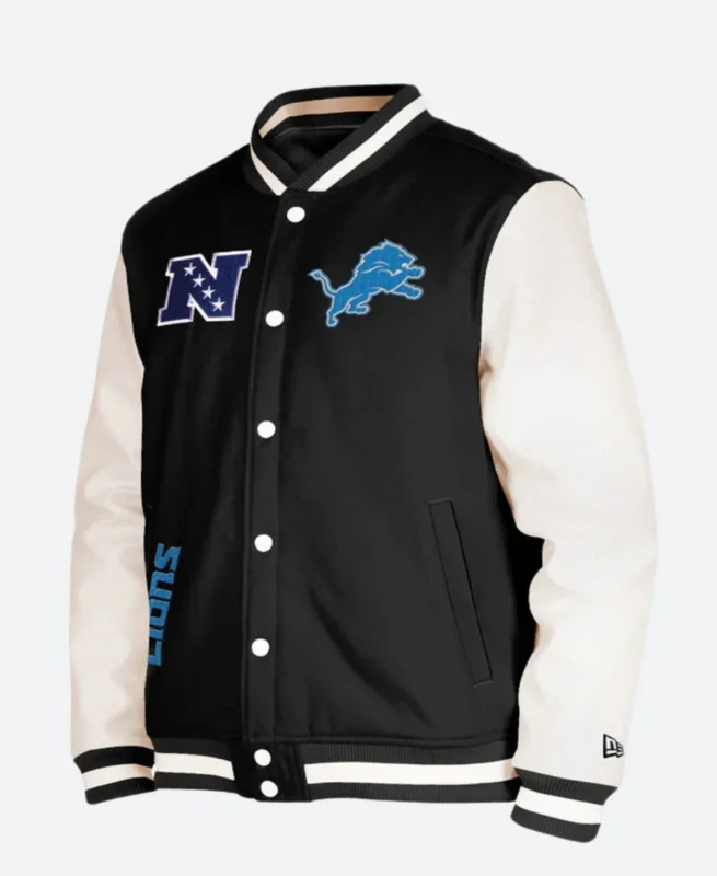 Buy the Detroit Lions Black Varsity Jacket – Bold Game Day Look with Sleek Street Style
