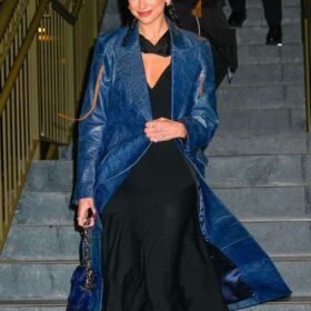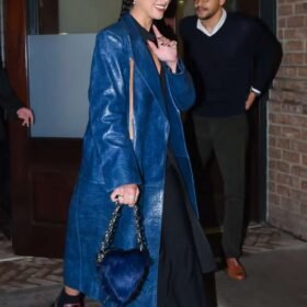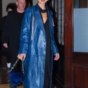 Dua Lipa Blue Leather Trench Coat
