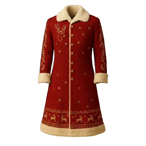You don’t need a sleigh to look like you just stepped off the North Pole. You just need this coat. Not the kind you wear once for a photo and never touch again. This is the elegant red velvet coat with hand-embroidered gold reindeer—the one people stop you to ask about at holiday parties, the one that turns heads at Christmas dinners, the one that doesn’t scream “costume”… it whispers, “I own this season.” Elegant Red Christmas Coat With Gold Reindeer Design