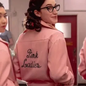 This jacket mirrors the look featured in Grease: Rise of the Pink Ladies, staying true to the light pink color, cropped structure, and iconic “Pink Ladies” script across the back. It’s a stylish nod to the spirit of rebellion and friendship seen in the show, making it instantly recognizable to fans and admirers alike.