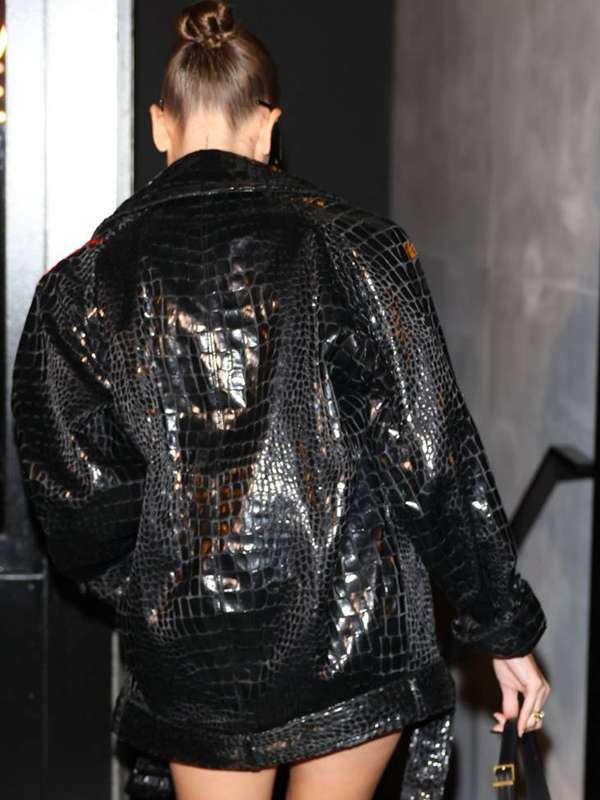 Hailey Bieber Paris Fashion Week Black Leather Jacket