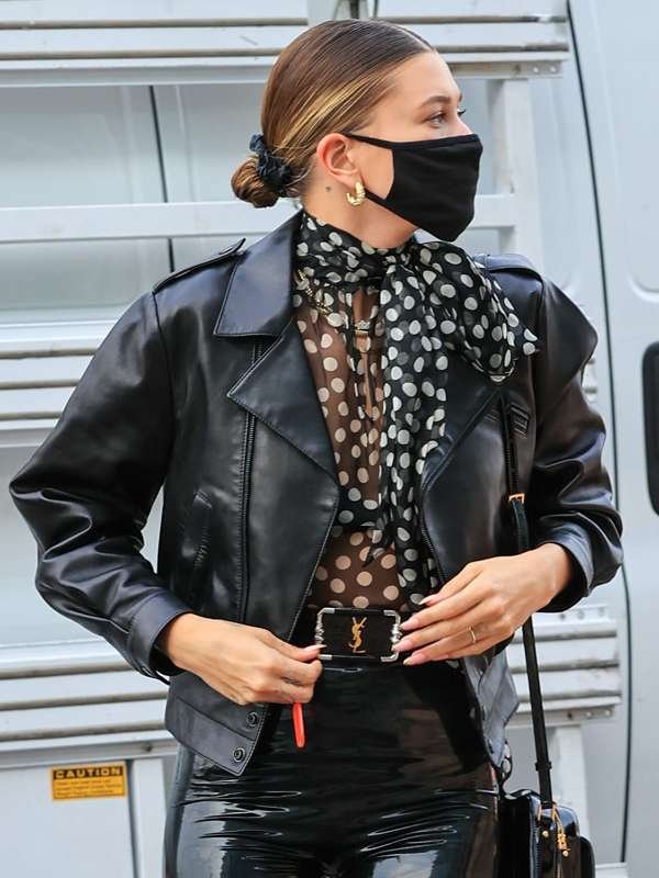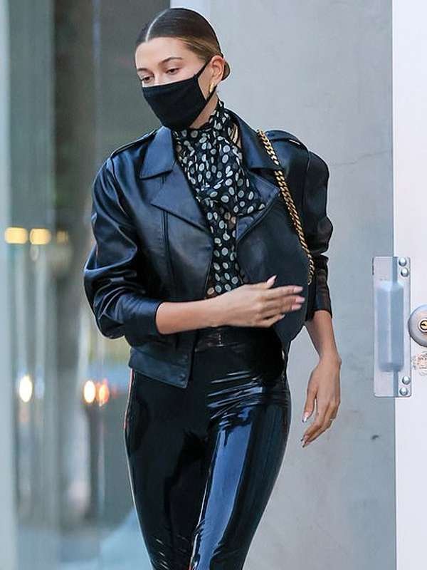 Hailey Bieber Street Style Black Leather Jacket