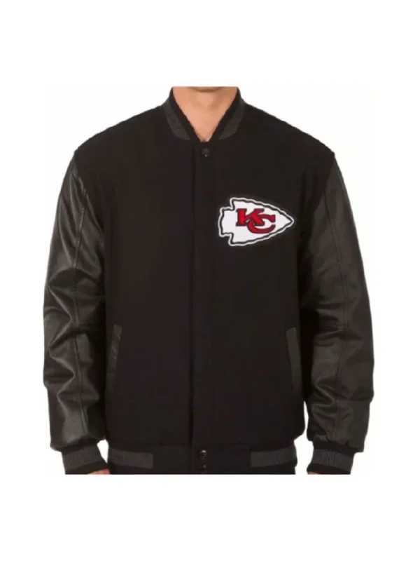 The Kansas City Chiefs Varsity Letterman Jacket is a must-have for die-hard fans who love vintage style and strong team pride. Made from a warm wool-blend body with leather sleeves, it features official Chiefs logos, embroidered detailing, and team-colored ribbed cuffs and waistband. The snap-button front and soft inner lining offer all-day comfort, whether you’re at the stadium or out on the town.