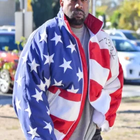 The Kanye West American Flag Bomber Jacket is a standout piece that combines patriotic flair with streetwear edge. Featuring a bold American flag design with red and white stripes on one side and white stars on a blue field on the other, this jacket makes a powerful visual statement. Kanye West was spotted wearing this jacket during his 2024 presidential campaign announcement, adding political and cultural significance to its design.