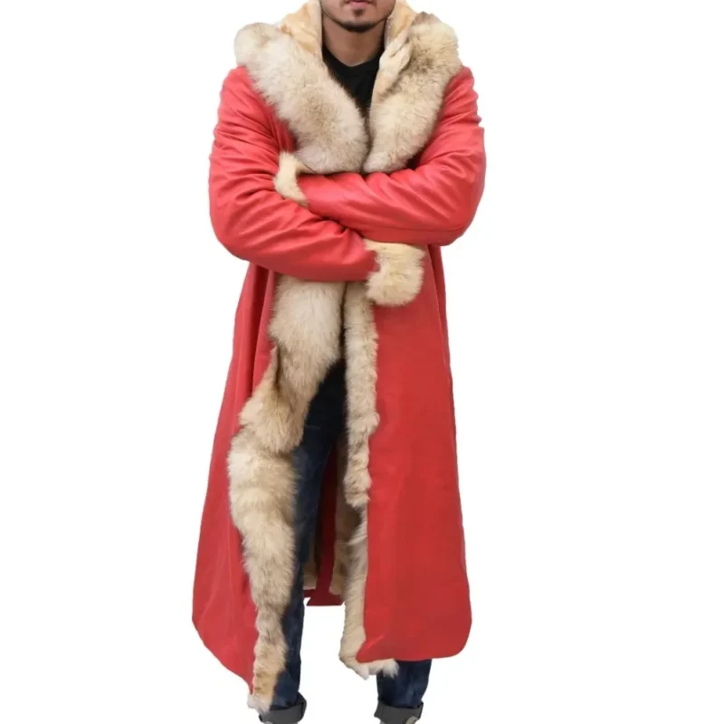 We didn’t guess the cut,fake the distress,got the original pattern from the costume department and matched every stitch. This isn’t shiny plastic leather—it’s heavyweight, hand-finished red leather with real texture, like it’s been through a blizzard, a rooftop chase, and three midnight deliveries. The collar? Thick, natural shearling—soft, dense, and cut exactly like Kurt’s, so it doesn’t flop, it frames. The belt? Solid gold-tone hardware, thick and heavy, not plastic junk. The lining? Quilted, insulated, and lined with brushed cotton—not cheap satin. And the epaulets? Real stitched detail. Functional. Not decorative. This coat doesn’t just look like Santa. It moves like him.Kurt Russell The Santa Claus Chronicles Shearling Red Leather Santa Coat