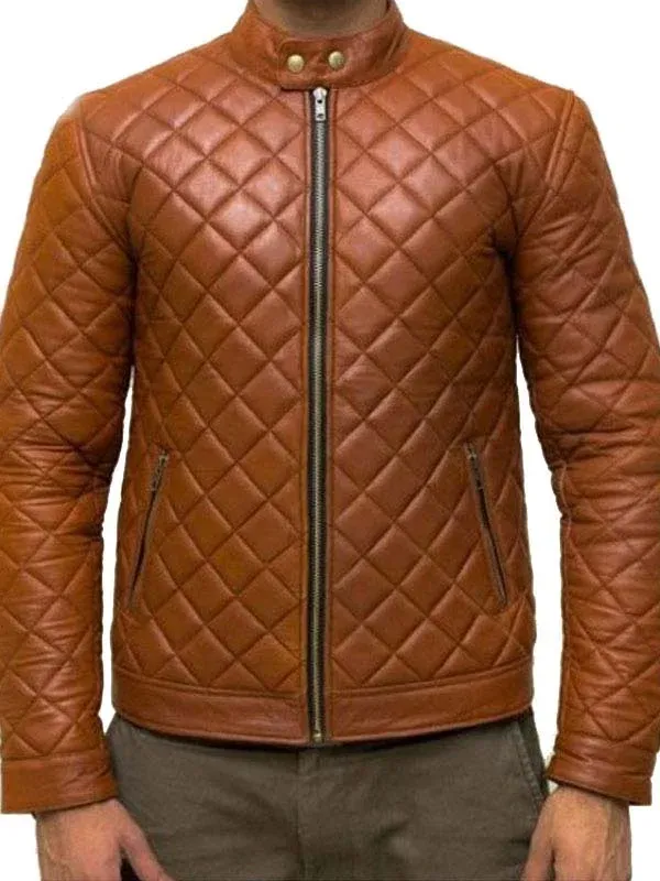 Quilted Brown Men’s Motorcycle Cafe Racer Leather Jacket
