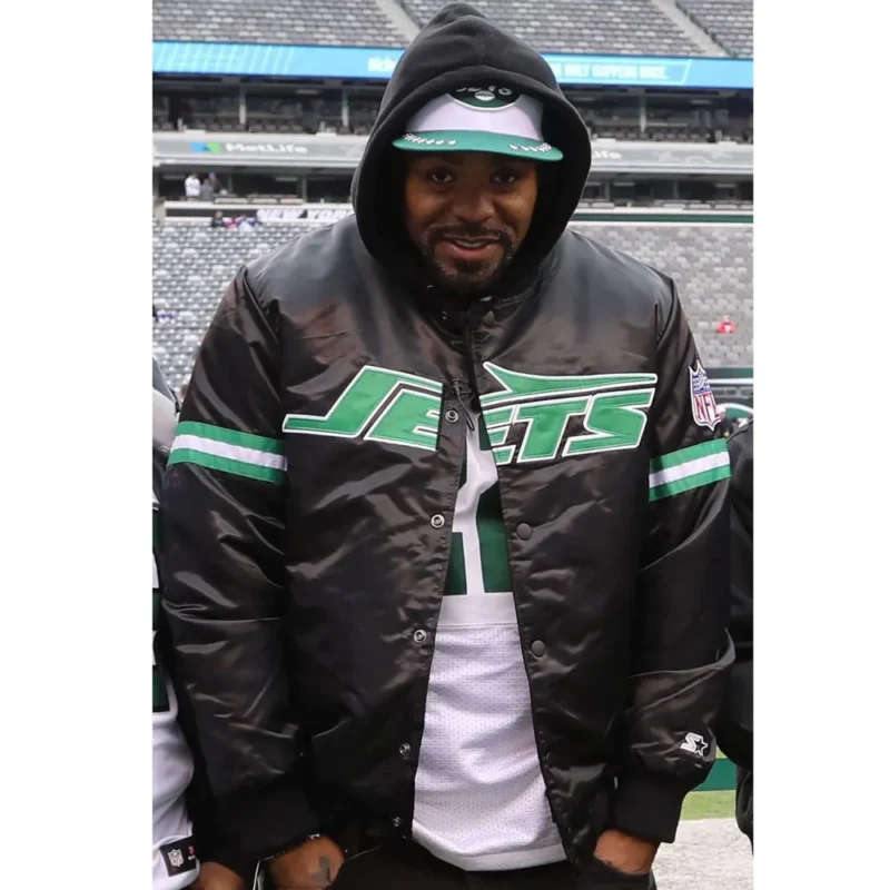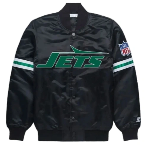 Take it back to the golden era of NFL style with this Jets Starter Jacket — a must-have for die-hard fans who want to bring vintage energy into their wardrobe. Finished in sleek black satin with bold details, this piece honors the legacy of New York football with serious throwback flair.