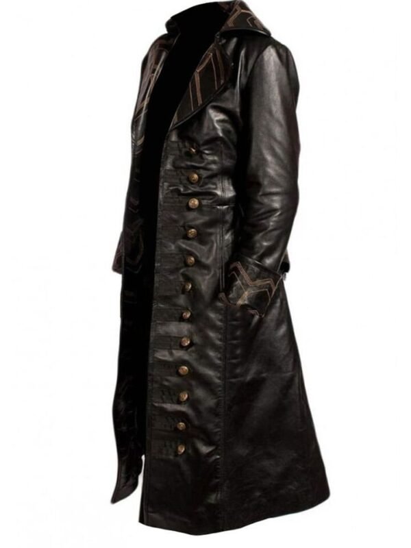 The coat’s dramatic flair lies in its long, flowing silhouette and rich, dark tones. Designed to exude authority and confidence, it features a high stand-up collar, decorative metal buttons, and a flared hem that sways with every step. The textured detailing and historical inspiration bring out a unique blend of sophistication and ruggedness — true to Hook’s pirate persona.