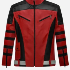 This jacket uses real leather to give a smooth, strong feel. The bright red patches on the sleeves and chest pop out against the black. The jacket feels soft yet firm. It fits well, hugs the shoulders, and gives shape to your look. The inside has a comfy lining that keeps you warm all day. Wear it while biking, hanging out, or going to events—it fits every moment.