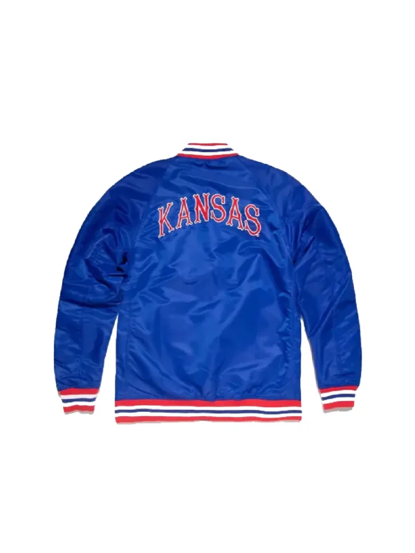 This jacket features the team’s signature royal blue color, representing the Kansas Jayhawks’ iconic team identity. With the Jayhawks logo proudly displayed on the chest, this jacket offers a perfect way to show your support for the team, whether you’re attending a game, hanging out with friends, or running errands. The jacket’s varsity-inspired design includes contrasting ribbed cuffs, collar, and waistband, ensuring a snug and comfortable fit while also adding a touch of vintage flair.
