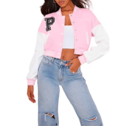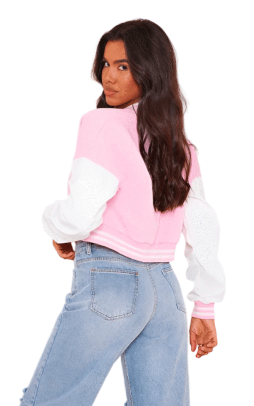 Designed for women varsity jacket lovers, this piece is incredibly versatile. Pair it with high-waisted jeans and platform sneakers for a casual-cool look. Style it over a bodycon dress and boots for sporty-chic vibes. Wear it open or buttoned—its cropped silhouette adapts to your mood. Whether you’re heading to class, brunch, a photoshoot, or a quick coffee run, the pink varsity jacket makes sure you stand out for all the right reasons.