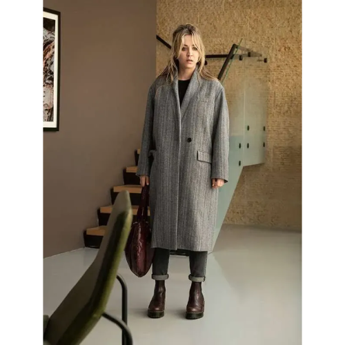 It’s the actual gray wool trench Kaley Cuoco wears as Cassie in Wake Up Dead Man—made with real wool, shawl collar, buttoned front, and that effortless drape that says “I may be in over my head, but I’m not out of style.”