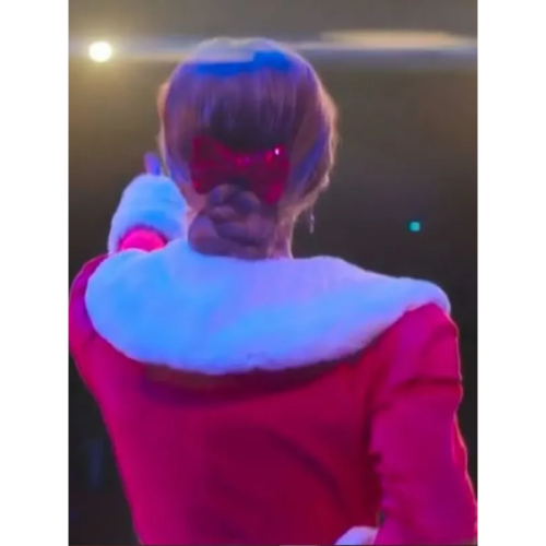 It’s thick red velvet, soft as a blanket, lined with smooth viscose, wrapped in a plush faux fur shawl collar, finished with shearling cuffs, and tied with a real belted waist—just like Britt Robertson wore as Ashley in The Merry Gentlemen (2024).