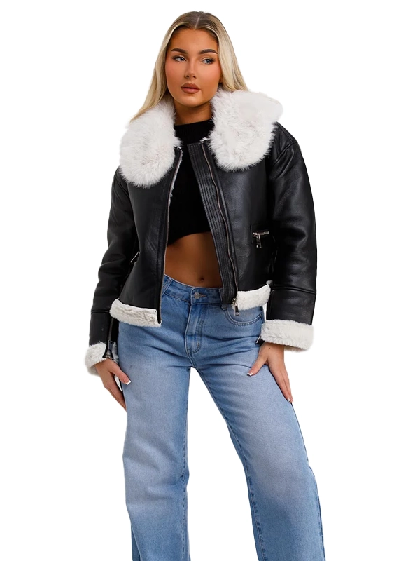 Women’s Black Leather Cropped Wide Shearling Collar Jacket