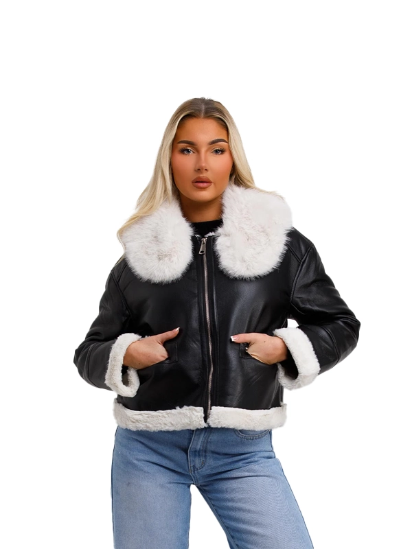 Women’s Black Leather Cropped Wide Shearling Collar Jacket