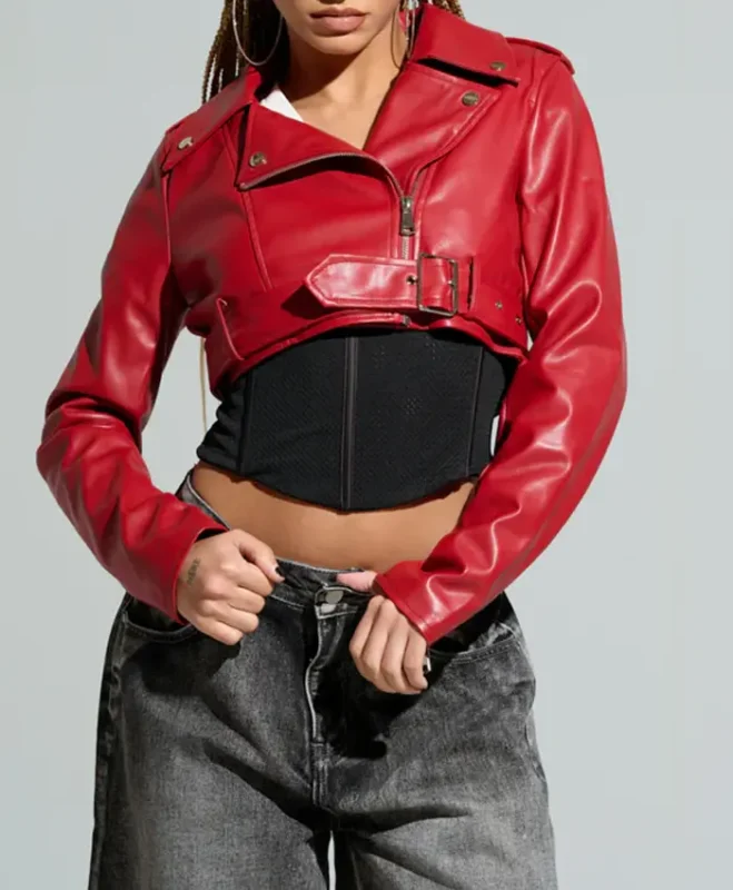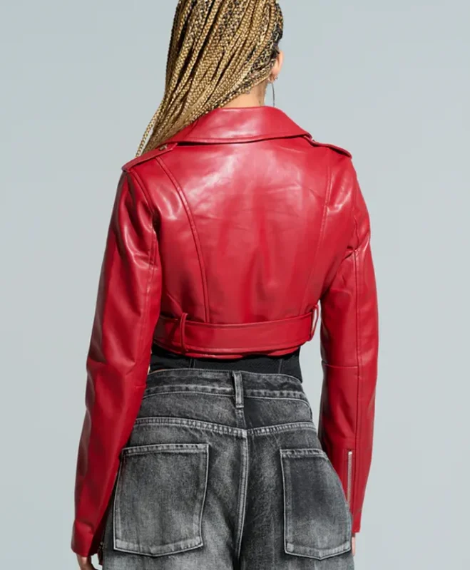 Womens Red Essential Cropped Leather Moto Jacket
