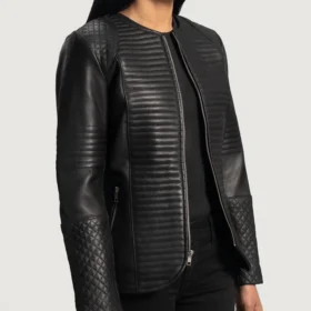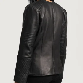 Womens Round Collar Quilted Black Leather Jacket